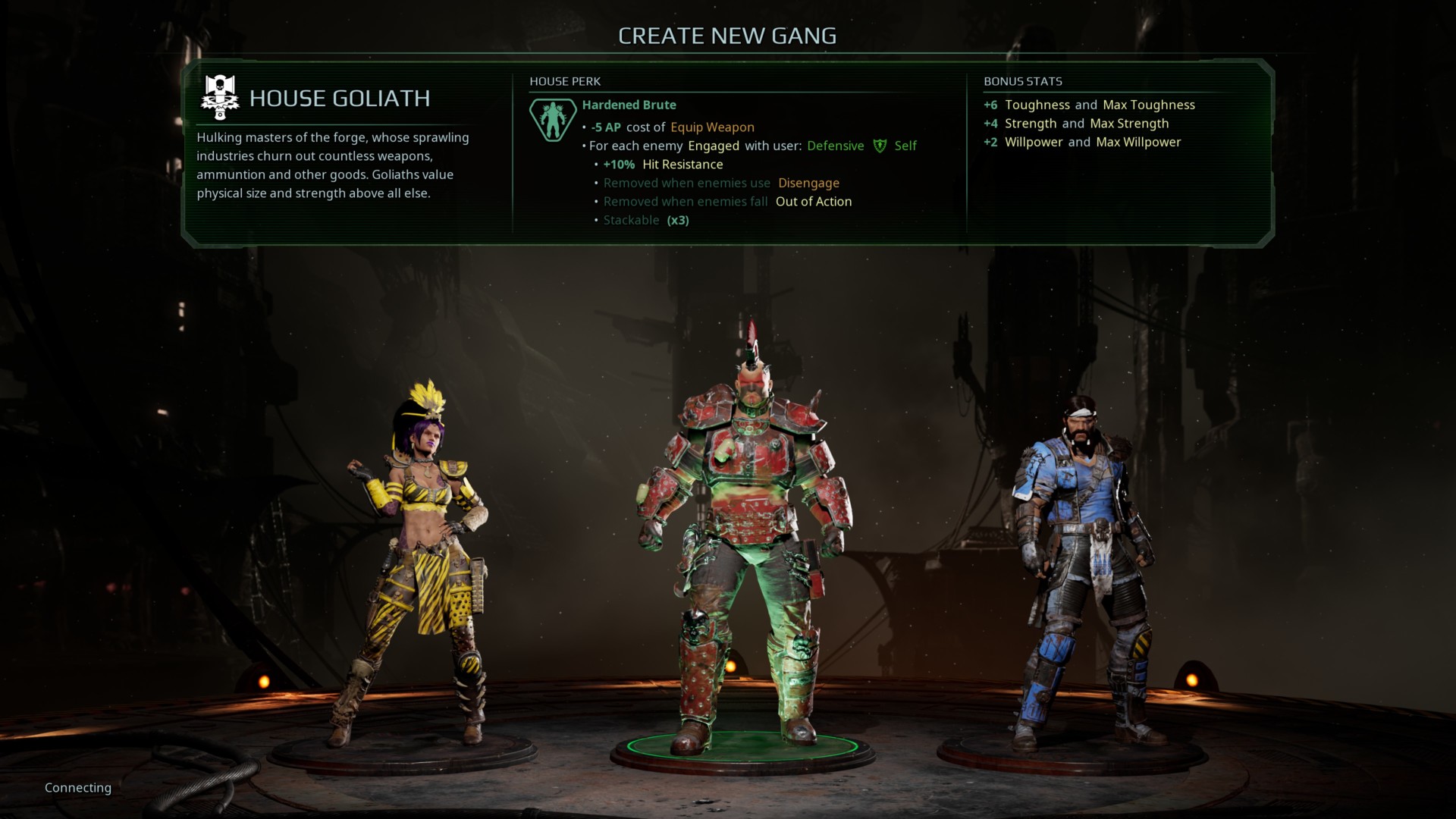 The House you choose for your gang will determine the look of certain characters (i.e., in House Escher’s case, you can only have female troopers). More importantly, however, are the stat bonuses and House perks.