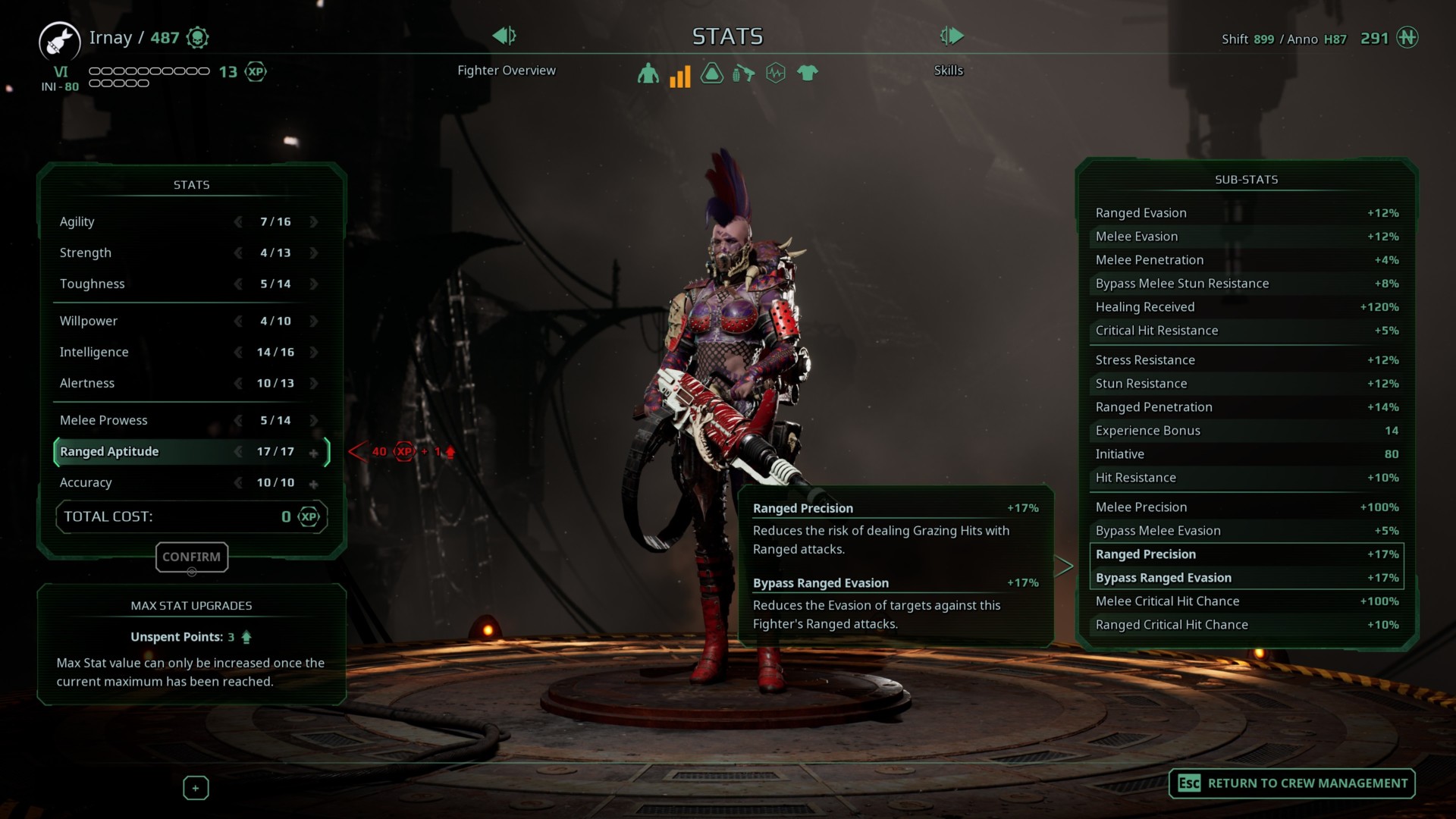 | Ranged Aptitude | Ranged precision/hit chance (reduced chance of landing grazing hits with ranged attacks) | Bypass ranged evasion (reduced target evasion versus ranged attacks) |
