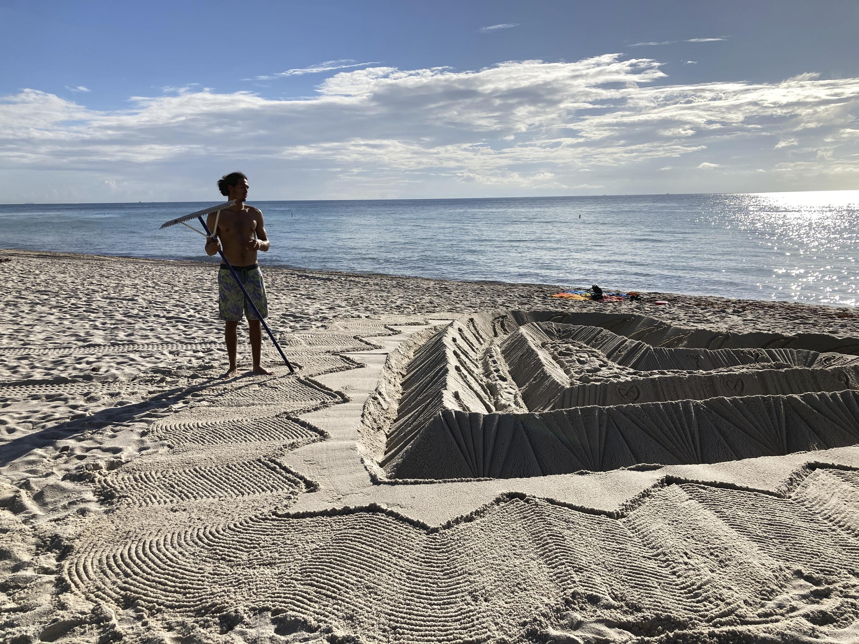 Using only a rake and the tip of its handle, the 21-year-old Miami Gardens hotel worker spent about two hours working shirtless in the blazing Florida sun creating his sculpture, digging out sand, piling it up and drawing waves and roses on its 1-foot-tall berms.