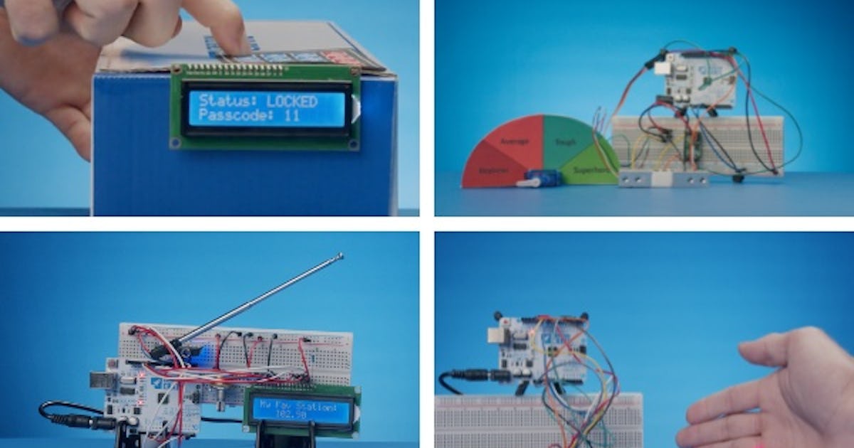 Included projects: Mood lamp, interactive memory game, sound wave distance detector, 2-player reflex game, weather station, lock box, audio visualizer, LED dice game, strength game, infrared security system, alarm clock, FM tuner, and more